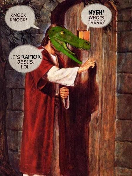 Web Raptor Jesus roamed the Earth circa 90000000-65000000 BHC Before Human Christ. Raptor Jesus refers to jokes conflating a velociraptor with Jesus Christ either by photoshopping a raptors head onto Jesus or by having Jesus interact with a raptor. Jesus Take The Wheel.